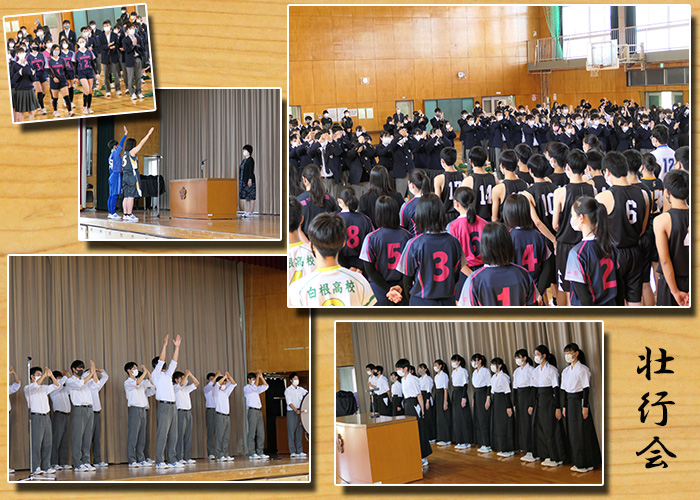 山梨県立白根高等学校 > 学校生活 > 壮行会・HR役員認証式・生徒総会 2021年4月30日カテゴリー: 学校生活 壮行会・HR役員認証式・生徒総会 本日(4月30日)の午後は、高校総体の壮行会が行われました。 選手の入場を拍手で迎え、各部の決意などの発表がありました。 応援委員によるエールがありましたが、今年は校歌や応援歌も歌えず・・・エールの大声を出せず残念です。(感染症予防のため) 選手の皆さんに直接エールを伝えてください! 壮行会の後は、HR役員認証式が行われました。 HR正副委員長が登壇して、代表者が校長先生より認証書を受け取りました。 そのあと、「いじめのない学校と社会をつくろう宣言」が生徒会長よりありました。 今年度の第1回生徒総会では、生徒会行事計画、予算案、白根祭について話し合いが行われました。 テーマに続き、テーマソングも発表されました。 今年の白根祭は準備期間が短くなっています。すぐにとりかかっていい学園祭を実施したいですね。
