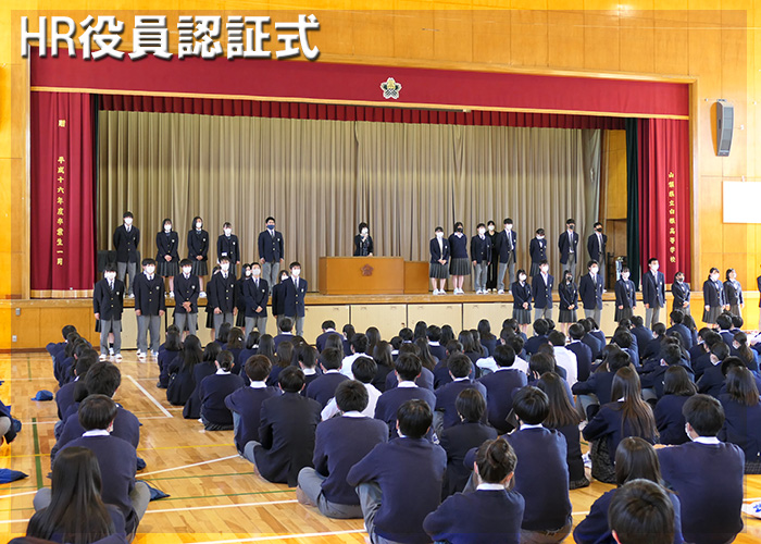 HR正副委員長が登壇して、代表者が校長先生より認証書を受け取りました。