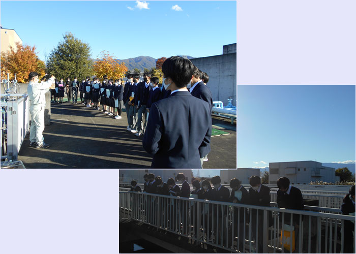 山梨県立白根高等学校 > 学校生活 > 1学年文理コース 企業見学会 2021年11月12日カテゴリー: 学校生活 1学年文理コース 企業見学会 昨日(11月11日)の午後に、1年文理コースのクラスは企業見学会を行いました。 山梨でSDGsを推進している企業、株式会社メイキョーの方にお話を聞きました。株式会社メイキョーはSDGsが提唱する「安全な水とトイレを世界中に」などの5つの目標に対して水や自然の環境保全の取り組みを宣言しています。 社長の㓛刀様より会社概要についてと、丸山様よりSDGsに関する取り組みについてのお話をしていただきました。 そして笛吹市石和町の峡東浄化センターの管理を行っているので、浄化センターの施設見学をさせていただきました。
