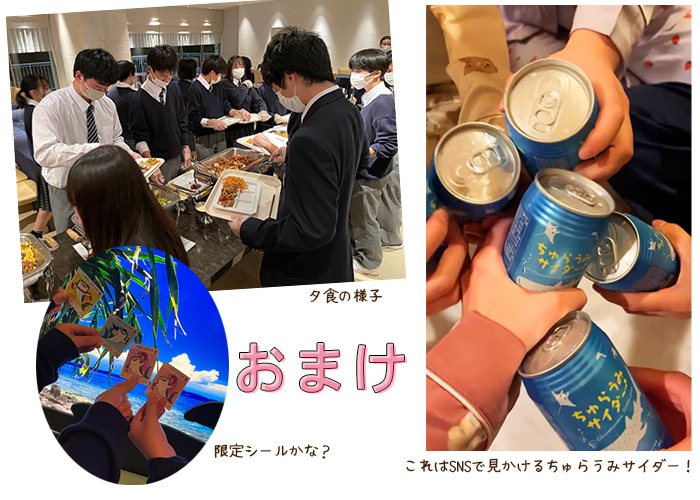 山梨県立白根高等学校 > 学校生活 > 修学旅行1日目 2022年11月7日カテゴリー: 学校生活 修学旅行1日目 昨日(11月6日日曜日)に出発しました修学旅行団より、写真が届きましたので様子を掲載します。 今年の修学旅行の行き先は(念願の)沖縄です! 朝早い集合でしたが、無事に飛行機に乗って沖縄につきました。 1日目の日程は、みなさんが楽しみにしていた美ら海水族館です。 ジンベイザメなどの素敵な写真をたくさん送っていただきました。 映える写真も♡ この後名護市の宿舎にて宿泊しました。 それっぽい写真ですが、お酒ではなく、サイダーです(笑)
