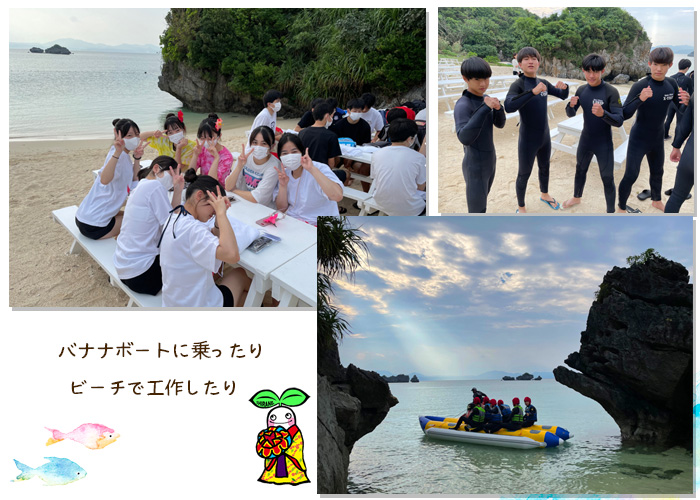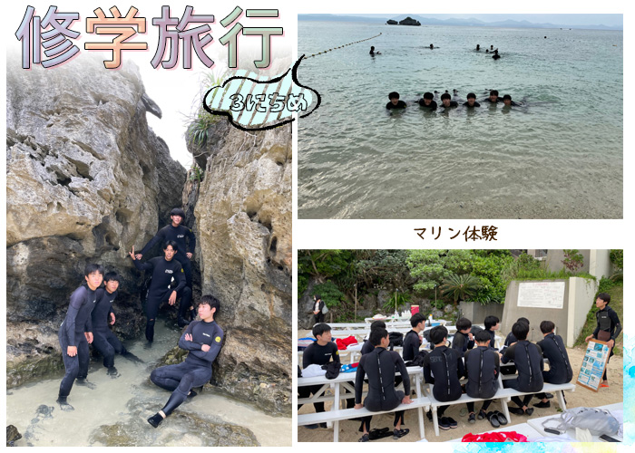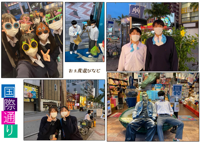 山梨県立白根高等学校 > 学校生活 > 修学旅行3日目 2022年11月8日カテゴリー: 学校生活 修学旅行3日目 本日(11月8日)は修学旅行3日目。グループごとに行動する日です。 マリン体験をする班やタクシー班でそれぞれ行動します。 マリン体験の写真は送られてきました。 楽しそうですね。 アメリカンビレッジとDMMかりゆし水族館の写真が届きました。 素敵スイーツや映える水族館の写真です。 古宇利島や万座毛へ行った生徒から写真が届きました。 夕方、一度ホテルにチェックインして国際通りを散策しました。 少しくらい空とヤシの木、華やかなネオンが素敵ですね。 夕食は鉄板焼き&ステーキをみんなで食べました。