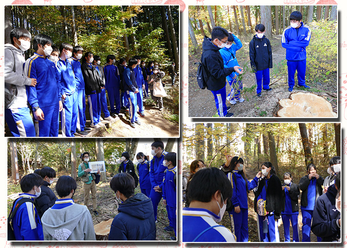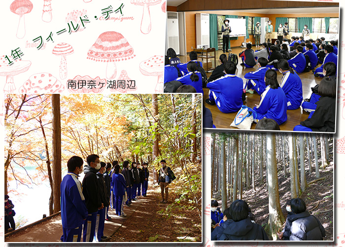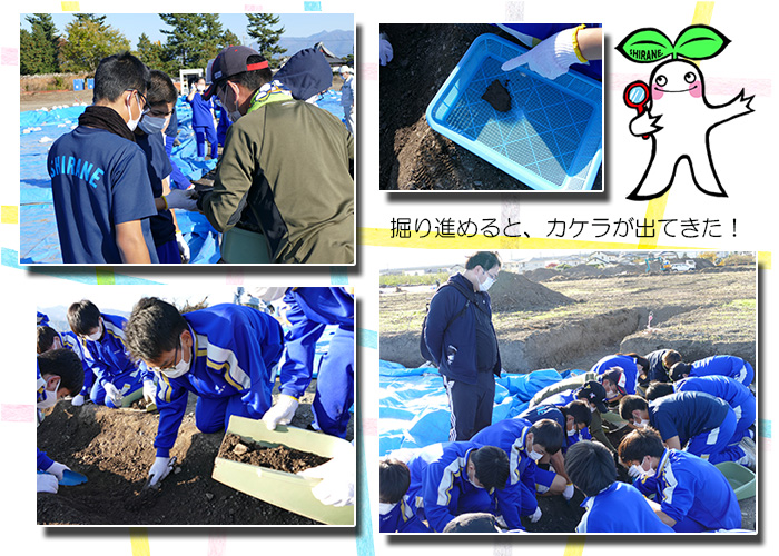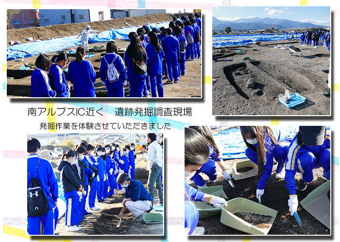山梨県立白根高等学校 > 学校生活 > 1学年 「フィールド・デイ」 2022年11月8日カテゴリー: 学校生活 1学年 「フィールド・デイ」 本日(11月8日)は、コミュニティー・スクールにおいて「地域を学ぶ」活動の一環として1学年が地域に出て野外活動を行いました。 南アルプスユネスコエコパーク内にある伊奈ヶ湖において野外活動を行い、南アルプス市周辺の豊かな自然環境を学びました。また、南アルプスIC近くの遺跡発掘調査現場で、遺跡の説明と発掘体験をさせていただきました。 2クラスずつ別れてバスで移動です。2,3組の様子を撮らせてもらいました。 最初に伊奈ヶ湖についた2,3組。ガイドの皆さんの紹介とすこし前回の復習などの座学を行い、自然観察スタート! 伊奈ヶ湖は紅葉がとても綺麗で、たくさんの人が訪れていました。 美しい風景の中でガイドの方たちから人工林の手入れについてや、動物のこと、南伊奈ヶ湖がどのようにできたかなどの説明をしていただきました。 年輪を数えたり、葉っぱの匂いを嗅いだり、自然の中で楽しそうでした。 午後は、遺跡の発掘調査現場を訪れました。 最初に説明をしていただきましたが、平安時代や6、7世紀の遺跡が出てきているそうです。 広大な敷地に古代の人が住んでいた痕跡がありました。砂と土で別れているところで判断がつくそうです。 古代の人が彫っただろう部分をみんなで掘り進めました。 スコップの持ち方や、堀り進め方を教えてもらいます。作業員さんたちと一緒に発掘作業を行いました。 出てきたものを確認してもらいます。土器のカケラのようなものも出てきていました。 手を動かして夢中に作業していた1年生。午前も午後も楽しそうでした。 貴重な体験をさせていただき、ありがとうございました。