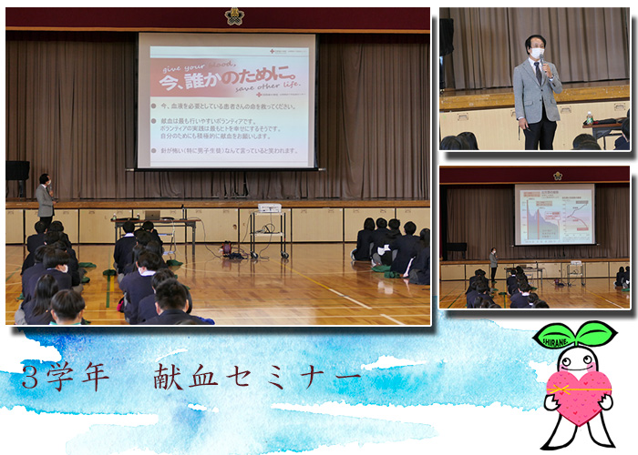 3年生では、再来週に行われる献血について、献血セミナーが行われました。