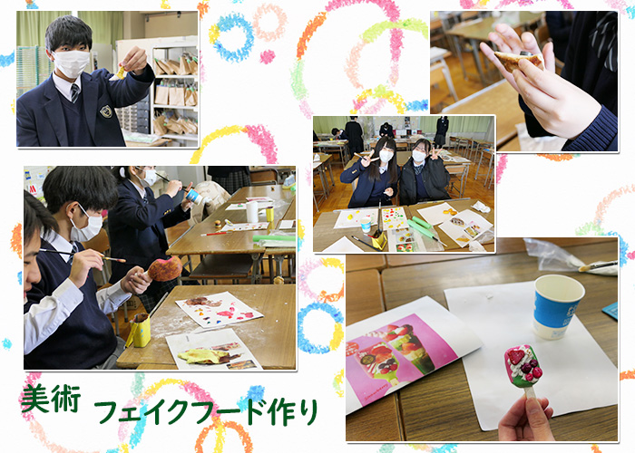 本日(2月21日)の授業風景です。2年生の美術ではねんどをつかってフェイクフードを作っていました。