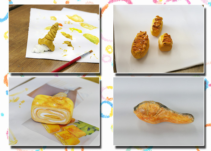 山梨県立白根高等学校 > 学校生活 > 授業風景(美術) 2023年2月21日カテゴリー: 学校生活 授業風景(美術) 本日(2月21日)の授業風景です。2年生の美術ではねんどをつかってフェイクフードを作っていました。 色付けしたり、ニスをぬたり、マグネットをつけたり・・・ 写真を見ながら本物に見えるように工夫をしていました。 いくつかピックアップしました。 つや、照り、しわ、焦げ目など、本物みたい!です。