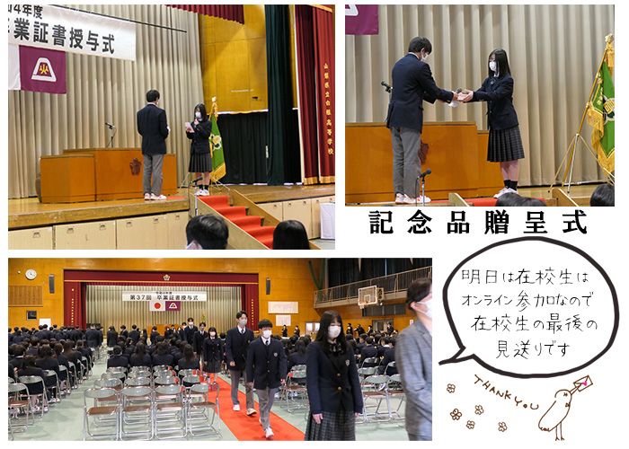 本日(2月28日)は卒業式予行と表彰式、記念品贈呈式が行われました。