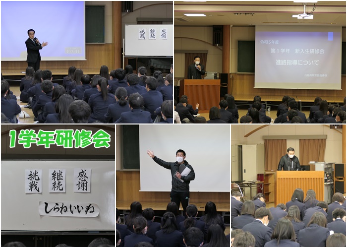 山梨県立白根高等学校 > 学校生活 > 1学年研修会 2023年4月13日カテゴリー: 学校生活 1学年研修会 本日(4月13日)は、白根高校生としてスタートをする新入生の研修会がありました。 最初に校長先生から「よく聞く当たり前の言葉ですが、挑戦・継続・感謝を忘れずに過ごして欲しい」とお話がありました。 前日の夜に皆さんのことを考えながら、書かれたそうです。達筆ですね。 教務係からは、一人一台端末(BYOD)についての注意点等、また生徒指導係からは、自転車通学におけるヘルメットの義務化等様々な話がありました。 その後も、進路指導係、生徒会保健環境係から、話がありました。 高校生活において必要とされる心構えだけでなく、今後社会に出てからも必要とされるお話がたくさんありました。 研修会の終了後、早速1年生が元気よく挨拶をしてくれました。(嬉しい‼) その後は個人写真の撮影会や5,6校時には、部活動紹介がありました。 明日からは、いよいよ授業が始まります。いいスタートを切ってください。