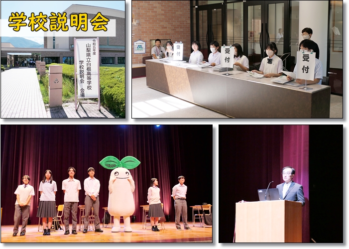 山梨県立白根高等学校 > 学校生活 > 学校説明会 2023年8月24日カテゴリー: 学校生活 学校説明会 白根っ子たちの夏休み 夏休みの白根っ子たちの頑張りを投稿します。 本日(8月24日)は、8月11日に開催された学校説明会の様子です。 桃源文化ホールで中学生とその保護者に向けた学校説明会が行われました。 本校に興味を持っていただきありがとうございました。 暑い中、貴重な時間をさいてお越しいただき、誠にありがとうございます。 吹奏楽部の演奏をはじめ、校長より挨拶、演劇部の白根高生の日々の様子の紹介、運動部の紹介、チアリーディング部よるダンス、学校紹介ビデオ、教務係と進路係からの説明が行われました。 終わった後は、個別相談会が行われました。 学校説明会の裏では・・・。 リハーサルの様子と準備や当日の運営のお手伝いをしてくれた生徒会と各部活の生徒さんの様子です。 お見送りを終えた白根っこ、帰宅中。 笑顔で中学生と保護者をお迎えしました。お疲れ様でした。 優しい先輩や先生方が来年度、楽しみに待っています。 白根高校をよろしくお願いいたします。