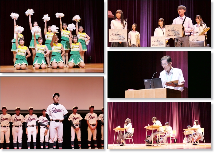 吹奏楽部の演奏をはじめ、校長より挨拶、演劇部の白根高生の日々の様子の紹介、運動部の紹介、チアリーディング部よるダンス、学校紹介ビデオ、教務係と進路係からの説明が行われました。