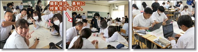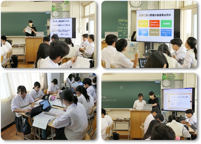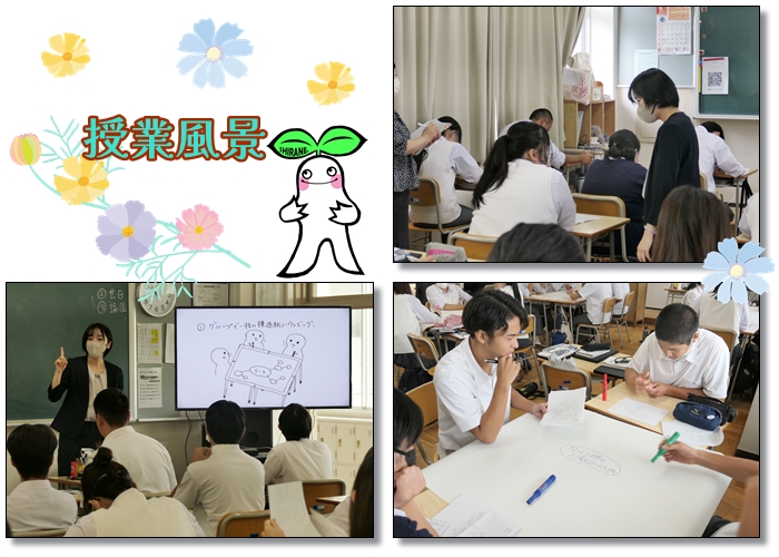 山梨県立白根高等学校 > 学校生活 > 授業風景 2023年9月22日カテゴリー: 学校生活 授業風景 本日(9月22日)は、研究授業がありましたので、撮影させていただきました。 2年2組(3時間目)の論理国語の授業の様子です。 「AI」という大きなテーマに対して、グループでディスカッション(議論)を行い、模造紙にウェビングマップ(マインドマップ、イメージマップ)の作成を行っていました。 ウェビングマップとは、思考を可視化し、整理するためのツールです。中心(テーマ)から広がっていく様子がクモの巣に似ていることから、そう呼ばれているみたいです。 討論も盛り上がりを見せていました。1番緊張しているのは、先生でした。 こちらは、1年3組(5時間目)の家庭科の授業の様子です。 グループワークで調べたことをPowerPointにまとめ、発表を行っていました。
