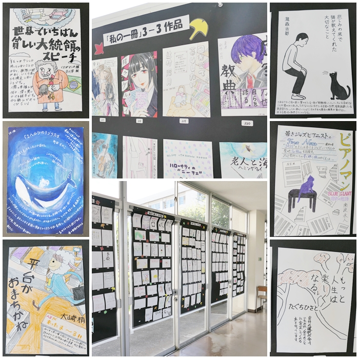 涼しくなってきて秋を感じてくるこの頃、生徒玄関前に「私の一冊」の作品が展示されました。