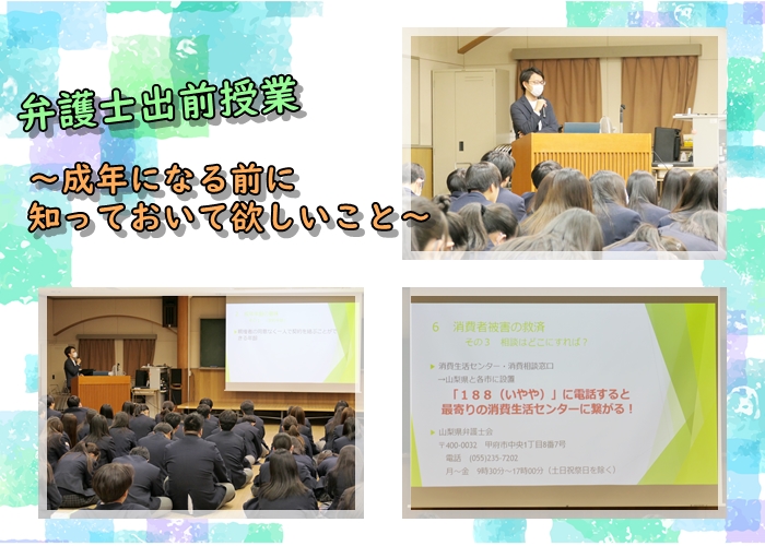 山梨県立白根高等学校 > 学校生活 > 弁護士出前授業 2024年3月22日カテゴリー: 学校生活 弁護士出前授業 3月19日の2時間目は2学年にて弁護士出前授業が行われました。 弁護士の中川様に、成年になる前に知っておいて欲しいことと題して、契約消費者トラブルについてお話をしていいただきました。 2022年4月1日に成年年齢が20歳から18歳に引き下げられました。 今までは20歳まで守られていたものが、2年も早く、社会に出る前の高校生の間に成年を迎えてしまいます。 契約には様々なルールがあり、そうした知識がないまま、安易に契約を交わすとトラブルに巻き込まれる可能性があります。社会経験に乏しく、保護がなくなったばかりの成年を狙い打ちにする悪質な業者もいます。 そうした消費者トラブルに遭わないために、契約に関する知識を学び、様々なルールを知った上で、その契約が必要かよく検討する力を身につけておきましょう。