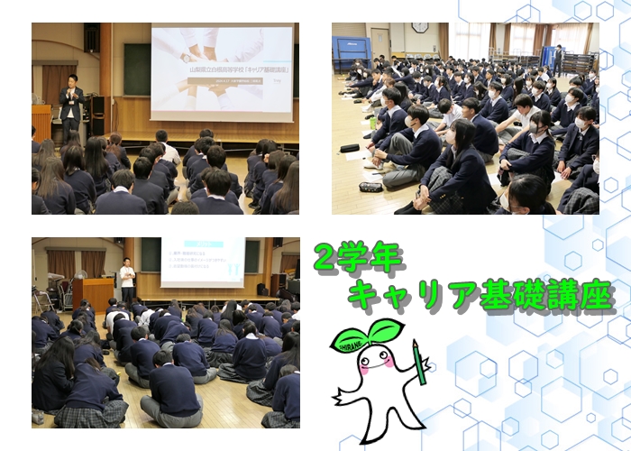 山梨県立白根高等学校 > 学校生活 > 2学年キャリア基礎講座 2024年4月18日カテゴリー: 学校生活 2学年キャリア基礎講座 昨日(4月17日)の5時間目は2学年にてインターンシップ事前学習の最初の授業として、キャリア基礎講座が行われました。大原学園甲府校より講師の先生が来てくださり、インターンシップに先だって「社会人になるとは?」、「仕事の選び方」、「インターンシップのメリットや心構え」についてお話をしてくださいました。 重要なところではしっかりとメモを取っていました。