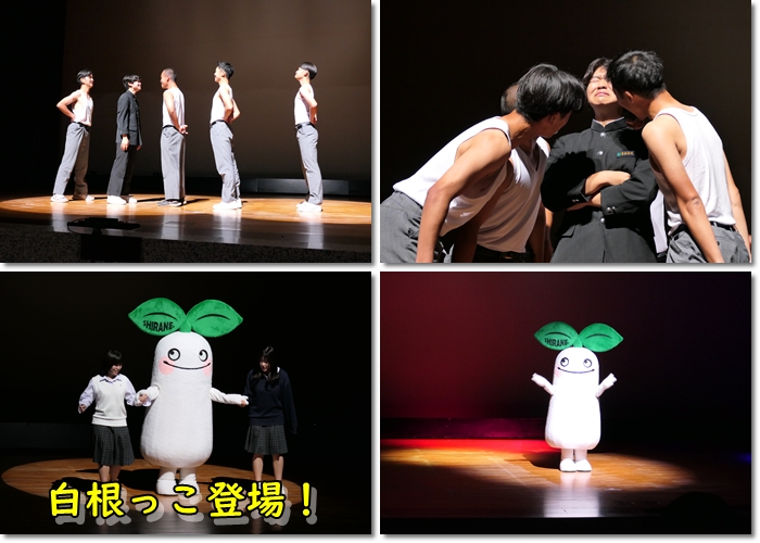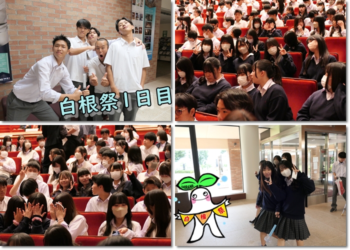 山梨県立白根高等学校 > 学校生活 > 白根祭1日目 NO,1 2024年6月20日カテゴリー: 学校生活 白根祭1日目 NO,1 本日(6月20日)、投稿時刻15:00。 現在の白根高生は、白根祭2日目の片付け&清掃作業の真っ只中です! まずは、白根祭1日目の開祭式から吹奏楽部の発表の様子をご覧ください。 前日は雨でしたが、無事に晴れ渡り、第41回、白根祭1日目は、桃源文化ホールで行われました。 今年のテーマは「drama」です。 放送部作成のオープニングムービーからスタートです! ムービーが終わると事件が発生。何と白根祭が占拠され、先生が・・・。 どうなってしまうのでしょうか? そして、白根祭占拠の結末は・・・。(保護者の皆さま、お子さんに是非お聞きください。) 開祭宣言の為、白根っこ登場!スポットライトを一身に浴び、生き生きとしています! ※クラス旗紹介、後日投稿いたします。 最初は、吹奏楽部の発表です。 本当は、6月18日の前日から投稿したかったのですが、パソコンの不調の為、今回は撮影に専念させていただきました。 写真枚数が、2,000枚を超えてしまい、今年も編集が追いつきません(アセアセ・・・) 頑張って編集しますので、生徒の皆さんの笑顔の写真を楽しみにお待ちください。