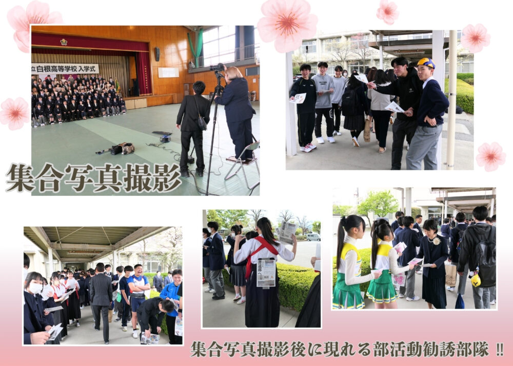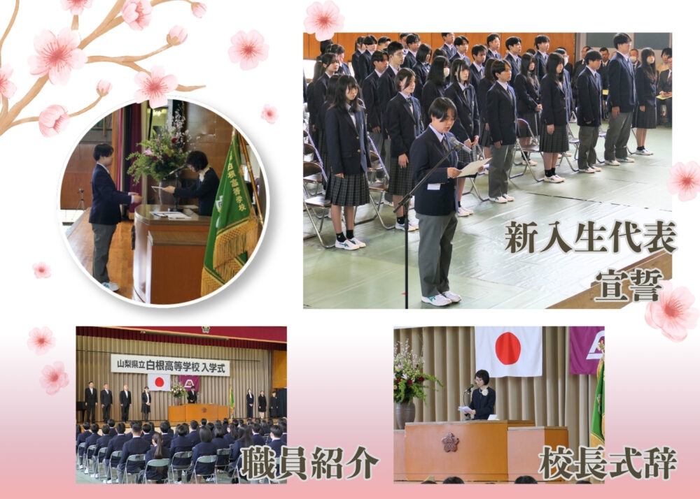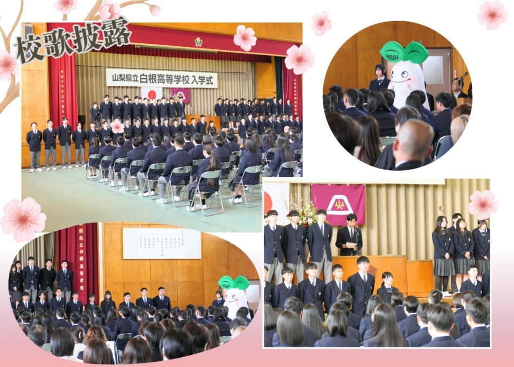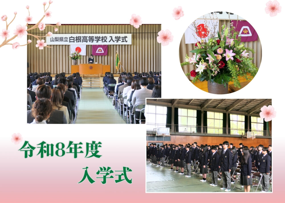 山梨県立白根高等学校 > 学校生活 > 令和8年度 入学式 2026年4月23日カテゴリー: 学校生活 令和8年度 入学式 4月9日、令和8年度 第43回入学式が行われました。 投稿が遅くなり、申し訳ございません。 入学式から2週間が経ちましたが、学校生活には少しずつ慣れてきましたか。 新入生の皆さん、ならびに保護者の皆さま、ご入学おめでとうございます。 ここでは、入学式当日の様子をご紹介します。 式では、校長先生より124名の新入生に入学許可があり、式辞が述べられました。 続いて、新入生代表による宣誓が行われ、祝辞、来賓紹介、職員紹介がありました。 式の締めくくりには校歌が披露され、生徒会役員や運動部の生徒による元気な歌声が、新入生や保護者の皆さまに届けられました。 式が終了した後、新入生はそれぞれの教室に移動し、クラス開き(初HR)を行いました。 初めての顔合わせに、緊張の残る一日となりましたね。 新入生のHRと、保護者の皆さまを対象としたPTA説明会が終了した後には、記念撮影が行われました。 体育館の外では、待ち構えていた2・3年生による部活動勧誘の元気な声が響き、新入生や保護者の皆さまの笑顔があふれていました。 1学期は行事も多く、疲れが出やすい時期です。 体調管理に気をつけながら、一日一日を大切に過ごしていきましょう。 運動部ならびに生徒会役員の皆さんは、校歌披露だけでなく、朝早くから駐車場での交通整理や会場までの案内、集合写真用ひな段の準備、そして終了後の片付けまで、さまざまな場面で力を尽くしてくれました。 気持ちよく手伝ってくれる姿に、校長先生も大変感心されていました。 本当にお疲れさまでした。