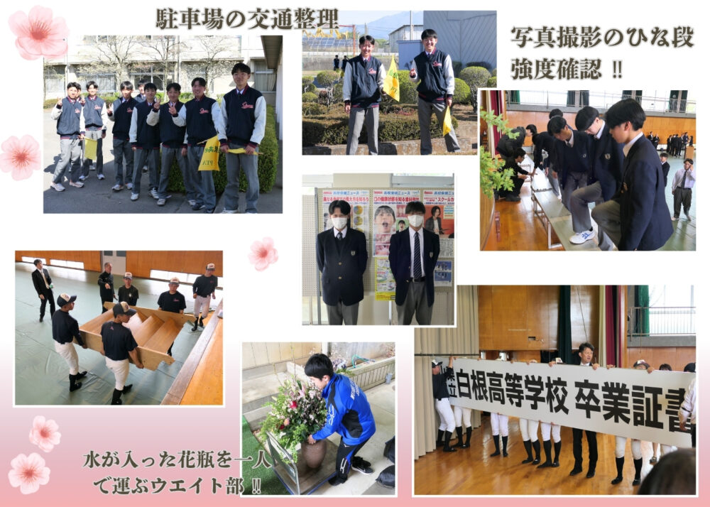 運動部ならびに生徒会役員の皆さんは、校歌披露だけでなく、朝早くから駐車場での交通整理や会場までの案内、集合写真用ひな段の準備、そして終了後の片付けまで、さまざまな場面で力を尽くしてくれました。