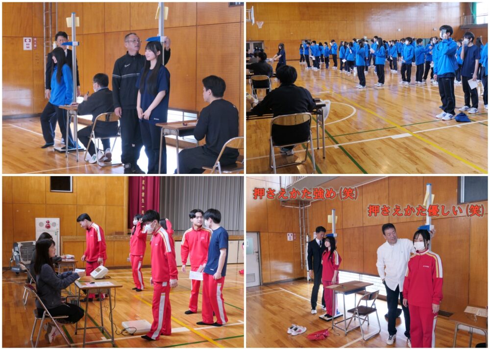 山梨県立白根高等学校 > 学校生活 > 対面式・身体測定 2026年4月24日カテゴリー: 学校生活 対面式・身体測定 4月10日は新入生と2・3年生との対面式が行われました。 入学して2日目、まだまだ緊張しています。 生徒会長と新入生代表から挨拶がありました。 対面式の後は、体育館と白朋館で各学年ごとに身体測定が行われました。 その他の時間は、LHRや学年集会が行われていました。 学年集会では、学年の先生からの挨拶、LHRでは、自己紹介やクラス委員の選出を行っていました。 身体測定のトップバッターは3年生からです。 着替えがとても早く、先生たちが慌てて器材の支度をしていました。 身長測定では、押さえるのが強めの先生と優しい先生。 強めの先生に計ってもらった生徒さんは、隣りでもう一度チャレンジ(笑) 結果は同じ数値でした。 (行事が前後してしまっていて申し訳ございません。追いつくように頑張って編集します。)